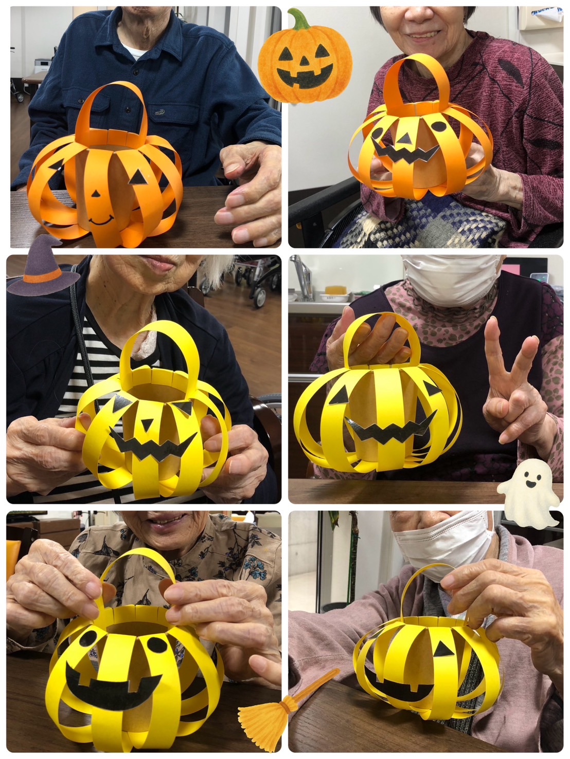 職員が土台を作り皆さんにはオレンジか黄色を選んでもらい顔のパーツを張り付ける作業をして