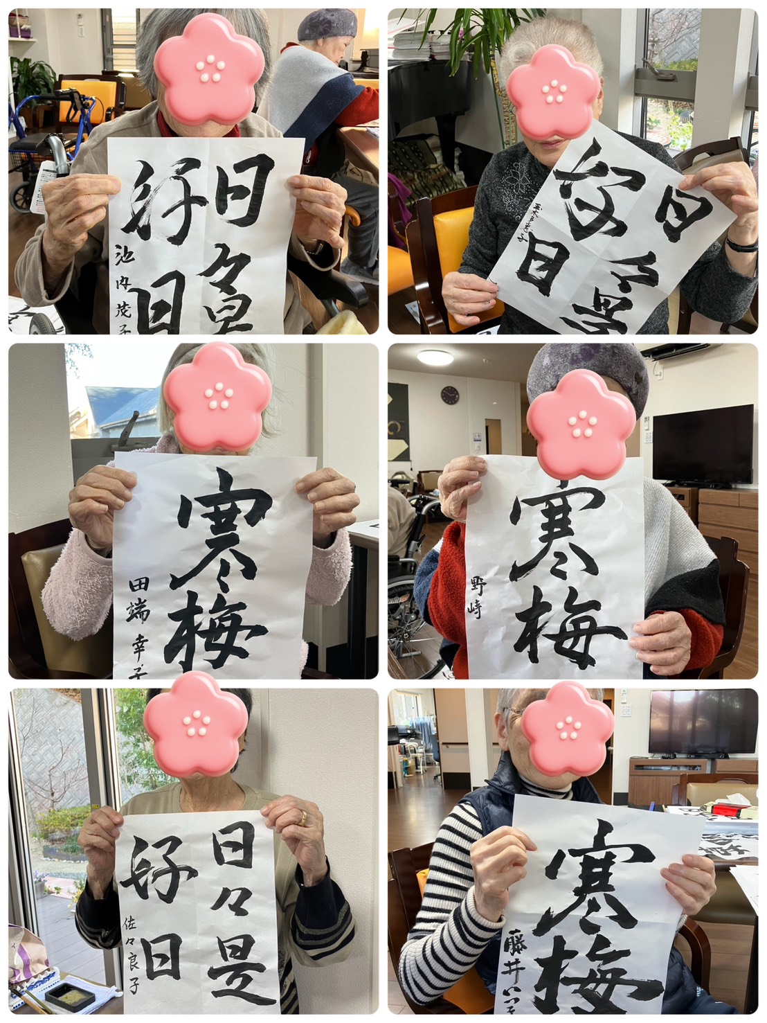 今回は季節柄「七草がゆ」・「寒梅」という文字を書いてもらいました。