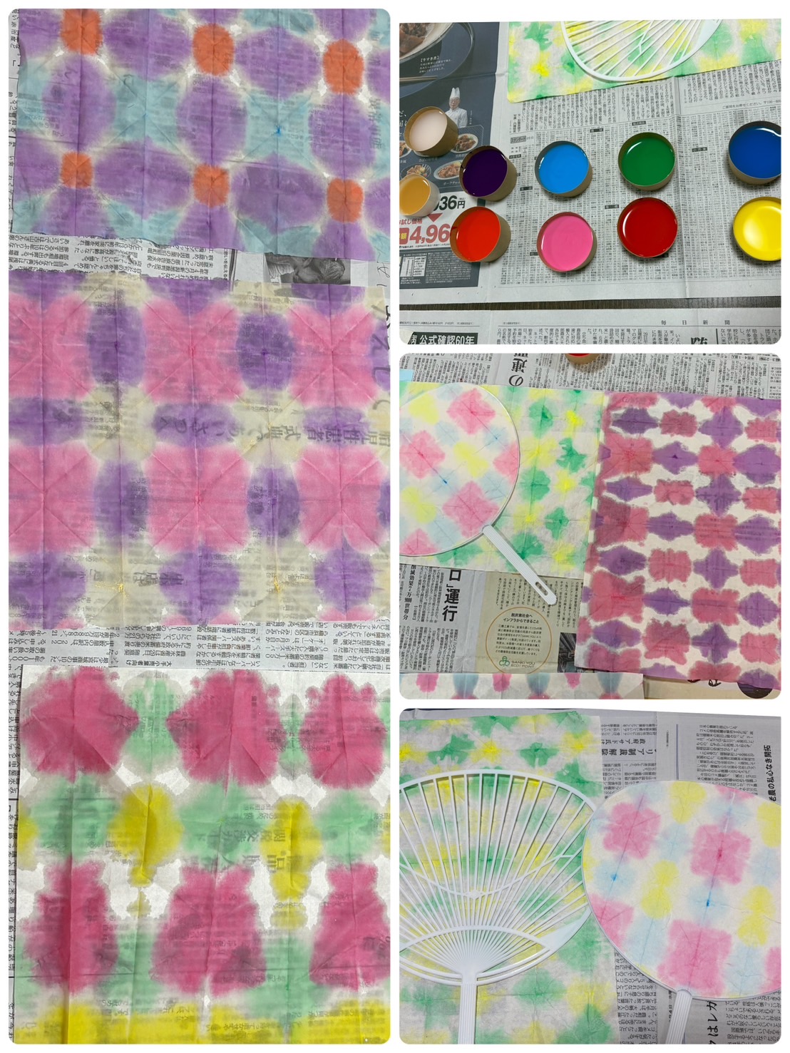 片面は和紙を絵具で染めてもらい、もう片面は可愛い飾りを貼ってオリジナルのうちわを完成☆ミ